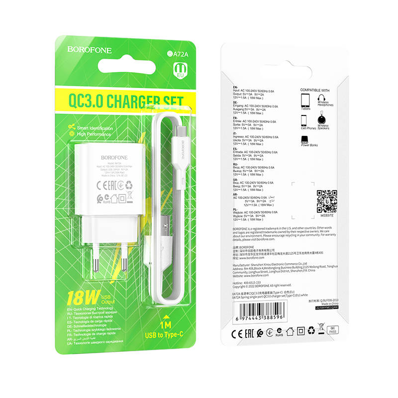 Сетевое зарядное устройство Borofone BA20A Sharp, зарядное устройство с одним USB-портом, штекером EU, комплект с кабелем Micro, выходной ток 2.1A. Материал: ABS + PC огнеупорный материал. Защита от нескольких цепей, интеллектуальная идентификационная микросхема, совместимая с 99% USB-устройствами для зарядки.