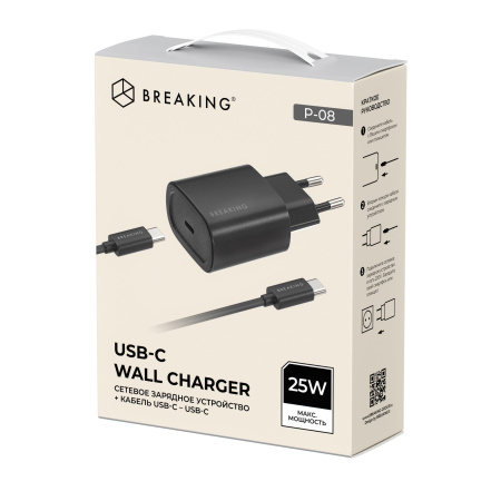Сетевое зарядное устройство BREAKING P-08 выполнено из ударопрочного ABS-пластика. Модель рассчитана на входное напряжение 100-240V и обеспечивает выходную мощность до 25W и выходной ток до 3.0A. Блок с одним разъемом USB-C. Модель поддерживает технологию быстрой зарядки Power Delivery и позволяет зарядить смартфон до 75% всего за 30 мин! Также, зарядное устройство поддерживает функцию защиты от перегрузок, короткого замыкания, импульсивного перенапряжения.