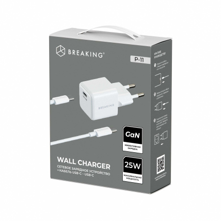 Сетевое зарядное устройство BREAKING P-11 выполнено из прочного ABS-пластика, оснащено технологией GaN, что позволяет модели работать с максимальной мощностью при минимальном нагреве. Модель рассчитана на входное напряжение 110-240V и обеспечивает выходную мощность до 25W и выходной ток до 3.0A. Зарядный блок оснащен разъемом USB-C. Модель поддерживает технологию быстрой зарядки Power Delivery, также поддерживает функцию защиты от перегрузок и короткого замыкания.