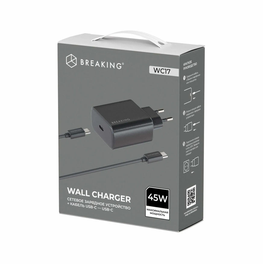 Сетевое зарядное устройство BREAKING WC17 выполнено из ударопрочного ABS-пластика. Модель рассчитана на входное напряжение 100-240 V и обеспечивает выходную мощность до 45 W и выходной ток до 3.0 A. Блок с одним разъемом USB-C. Модель поддерживает технологию быстрой зарядки Power Delivery и позволяет зарядить смартфон до 75% всего за 25 мин! Также зарядное устройство поддерживает функцию защиты от перегрузок, короткого замыкания, импульсивного перенапряжения.