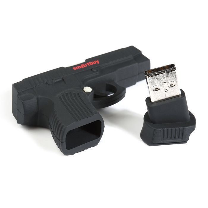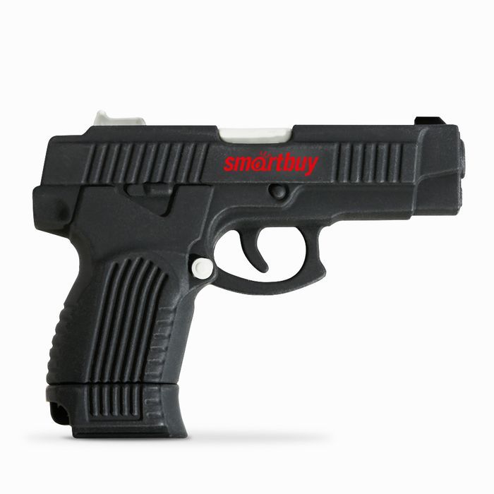 USB-накопитель SmartBuy выполнен в виде миниатюрного пистолета. Корпус обеспечивает надежную защиту устройства от влаги, пыли и повреждений.