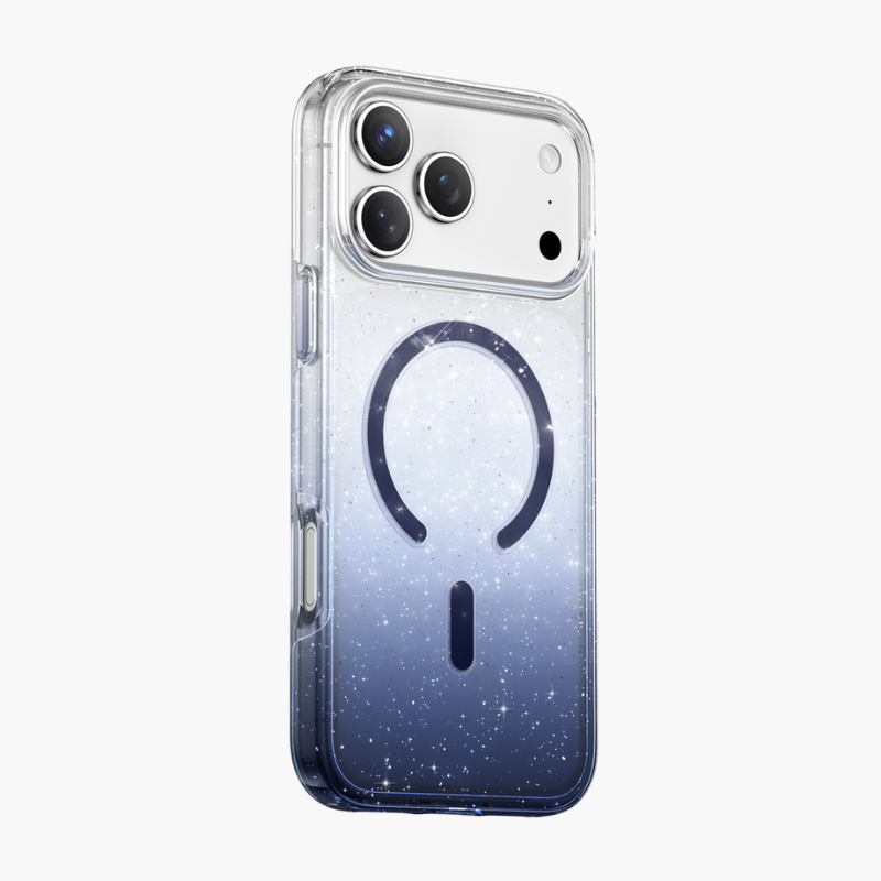 Градиентный цвет с искрящимися блестками в прозрачном чехле подчеркивает изысканную эстетику. В чехле предусмотренны магниты MagSnap для автоматического выравнивания и надежной фиксации беспроводной зарядки. AF-покрытие на внешней поверхности повышает устойчивость к царапинам и отталкивает отпечатки пальцев. Ударопоглощающие края из TPU и жесткая задняя панель из прочного пластика обеспечивают защиту военного класса.