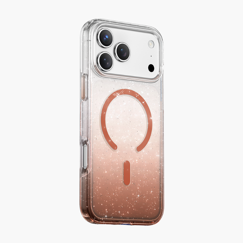 Градиентный цвет с искрящимися блестками в прозрачном чехле подчеркивает изысканную эстетику. В чехле предусмотренны магниты MagSnap для автоматического выравнивания и надежной фиксации беспроводной зарядки. AF-покрытие на внешней поверхности повышает устойчивость к царапинам и отталкивает отпечатки пальцев. Ударопоглощающие края из TPU и жесткая задняя панель из прочного пластика обеспечивают защиту военного класса.