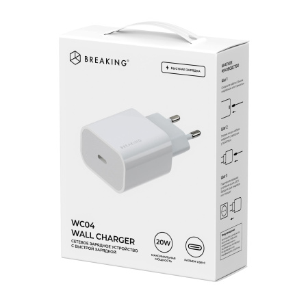 СЗУ Breaking WC04, USB-C, PD 20W, QC 3.0, 3A - сетевое зарядное устройство мощностью 20 Вт подходит для пополнения энергоресурса смартфона, планшета, фитнес-браслетов и смарт-часов. Максимальный показатель пропускного тока для модели составляет 3000 мА и сочетается с возможностью ускоренной зарядки Quick Charge 3.0 и Power Delivery. В конструкции сетевого зарядного устройства предусмотрен один разъем USB Type C.