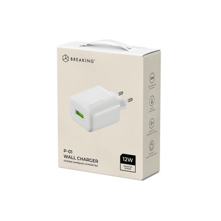 Сетевое зарядное устройство BREAKING Р-01 выполнено из прочного ABC-пластика. Модель рассчитана на входное напряжение 110-240V и обеспечивает выходную мощность до 12W и выходной ток до 2.4A. С одним разъемом USB-A. Модель поддерживает функцию защиты от перегрузок и короткого замыкания.