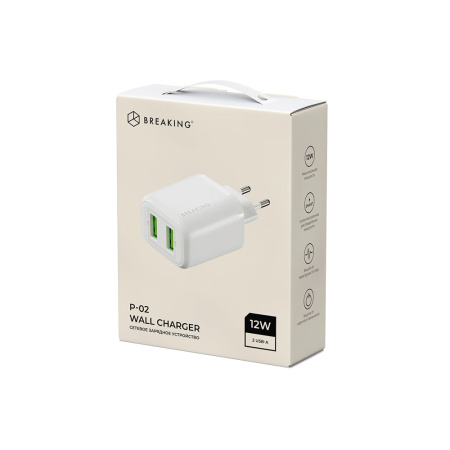 Сетевое зарядное устройство BREAKING P-02 выполнено из высокопрочного пластика. Модель рассчитана на входное напряжение 110-240V и обеспечивает суммарную выходную мощность до 24W и выходной ток до 2.4A. Два разъема USB-A позволяют заряжать одновременно два устройства. Модель поддерживает функцию защиты от перегрузок и короткого замыкания.