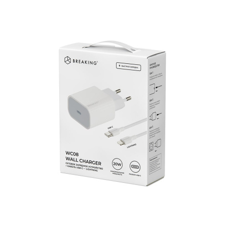 Сетевое зарядное устройство BREAKING WC08 выполнено из прочного ABC-пластика. Модель рассчитана на входное напряжение 110-240V и обеспечивает выходную мощность до 20W и выходной ток до 3.0A. С одним разъемом USB-C. Модель поддерживает технологию быстрой зарядки Power Delivery, также поддерживает функцию защиты от перегрузок и короткого замыкания.