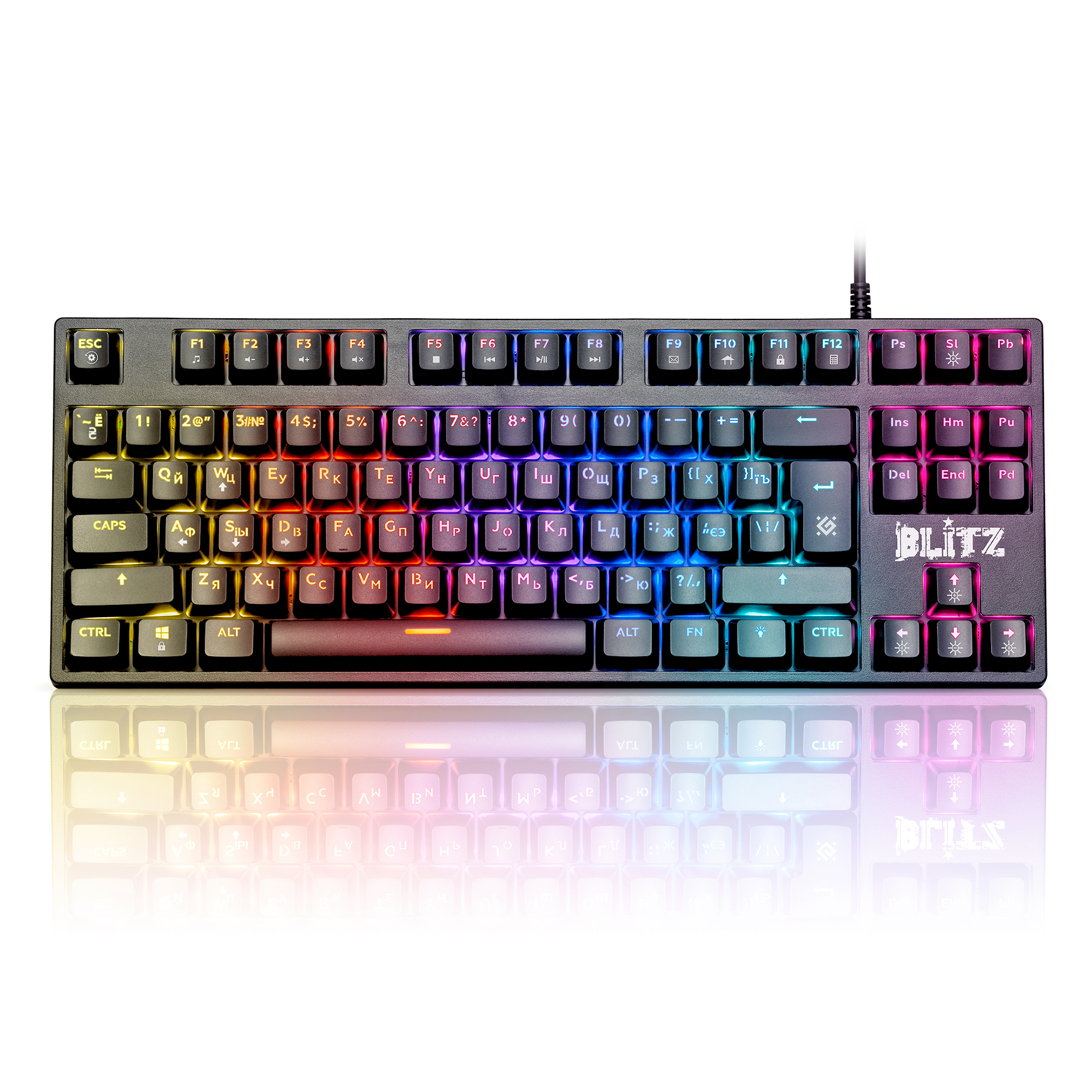 Звонкий звук / щелчок переключателейРаспознает одновременное нажатие до 25 клавиш25 клавиш: Q, A, Z, W, S, X, E, D, C, R, F, V, T, G, B, M, Space, Tab, Ctrl, Alt, Shift, ↑↓←→. Радужная подсветка12 режимов подсветкиПодсветка символов и клавишРегулируемая яркость подсветкиМеняйте яркость подсветки с помощью комбинации клавиш FN+Стрелки вверх/вниз.3-уровневая регулируемая яркость подсветкиУправление скоростью динамической подсветки FN+стрелки влево/вправоВозможность выключения подсветкиИспользуйте кнопку Scroll Lock для полного отключения подсветки. Повышенная износостойкостьТехнология Double injectionСимволы не сотрутся, так как клавиши отлиты из двух цветов пластика: черный для области кнопки и белый/прозрачный для символов. Аппаратная блокировка клавиши WIN во время игрыГорячие клавиши для быстрого доступа к офисным, мультимедийным и интернет приложениямУгол наклона клавиатуры регулируется с помощью выдвижных ножек