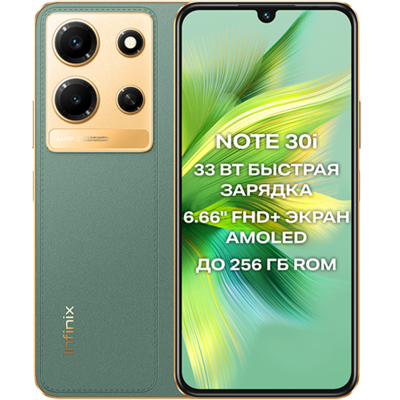 Infinix NOTE 30i — смартфон, объединивший в себе высокую производительность, яркий дизайн, продуманную эргономику и отличную оптику. Корпус выполнен в насыщенном черном цвете, который переливается на свету. Мощный Устройство работает на восьмиядерном процессоре MediaTek Helio G85, производительности которого хватает для повседневных задач.