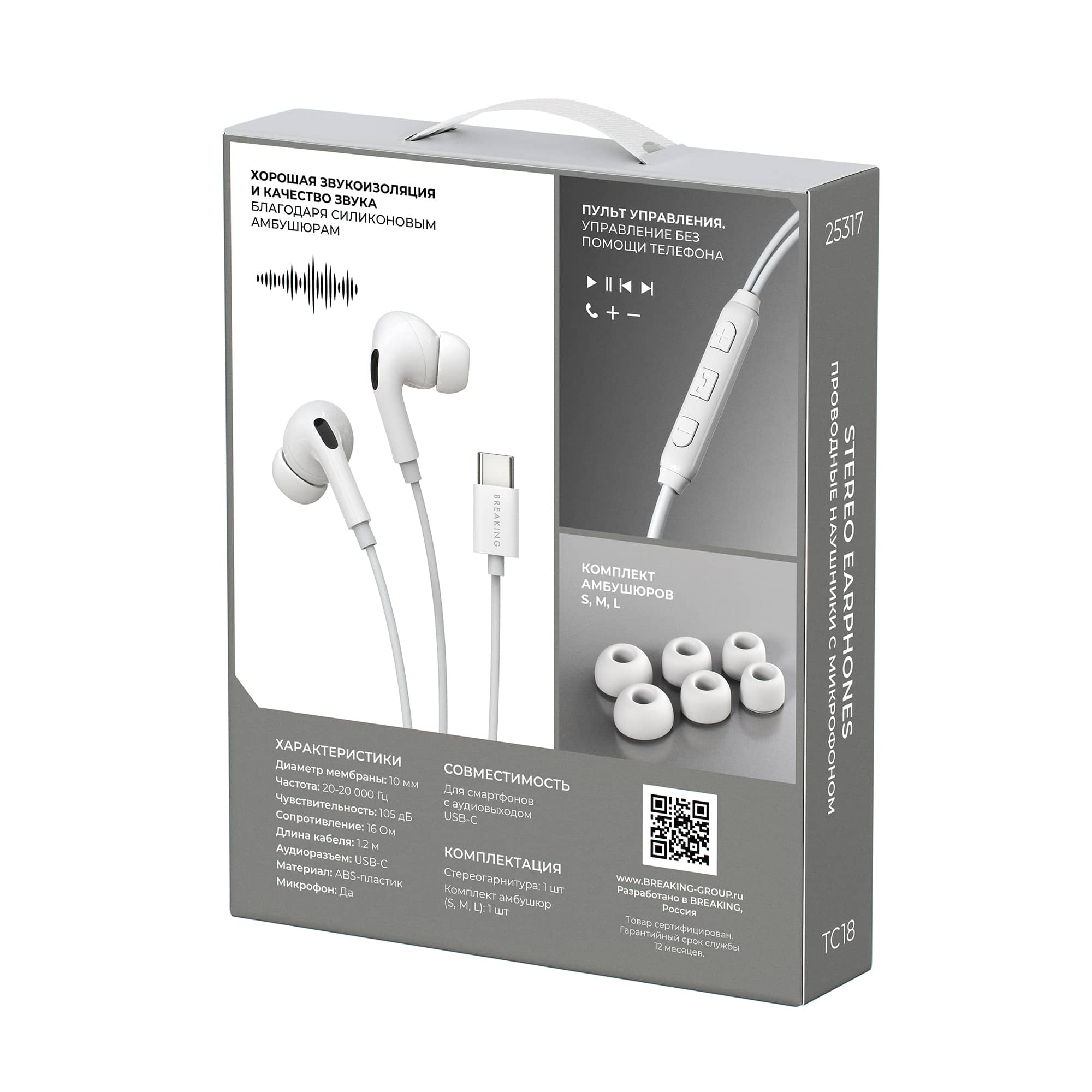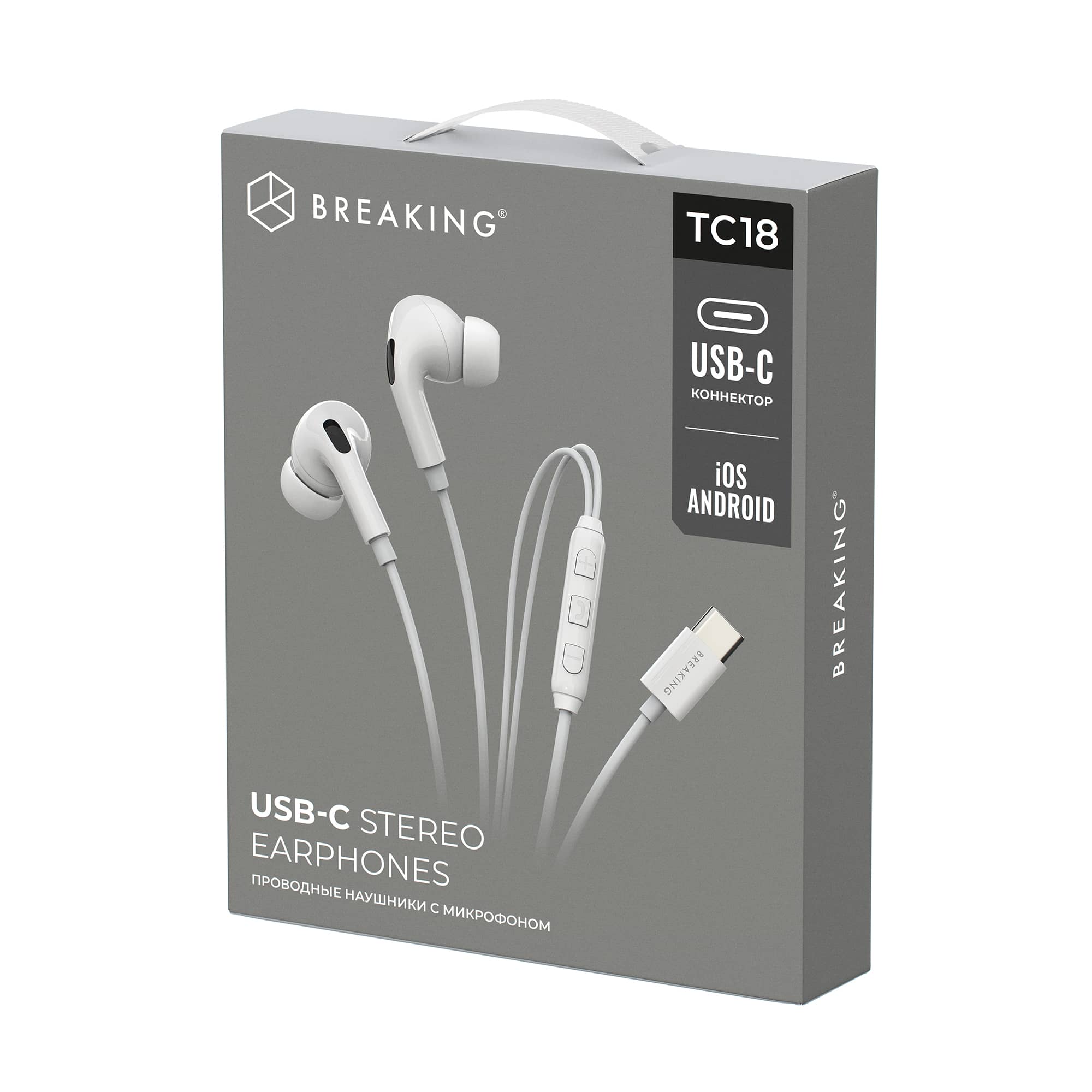 Проводная гарнитура BREAKING TC18 предназначена для прослушивания музыки. Подключается с помощью разъема USB-C. Наличие микрофона позволяет пользоваться наушниками как гарнитурой для разговоров по мобильному телефону. Легкие внутриканальные вкладыши имеют мягкую силиконовую конструкцию для комфортного использования, а также обладают широким частотным диапазоном, который обеспечивает четкий звук с хорошим качеством. Наушники изготовлены из экологического материала ABS пластика.