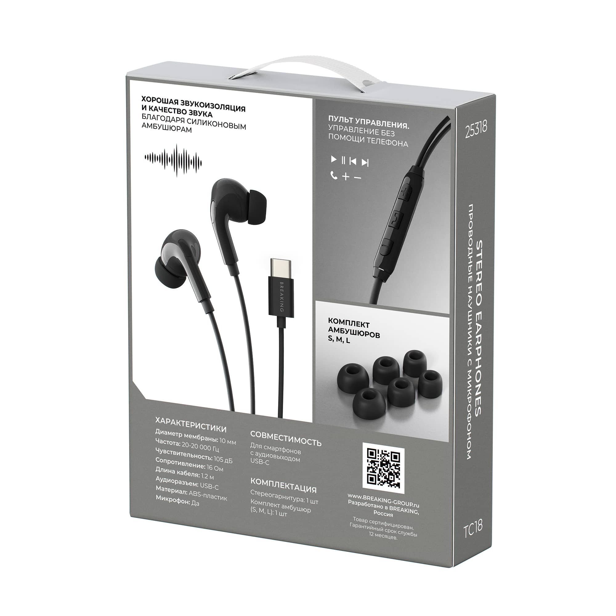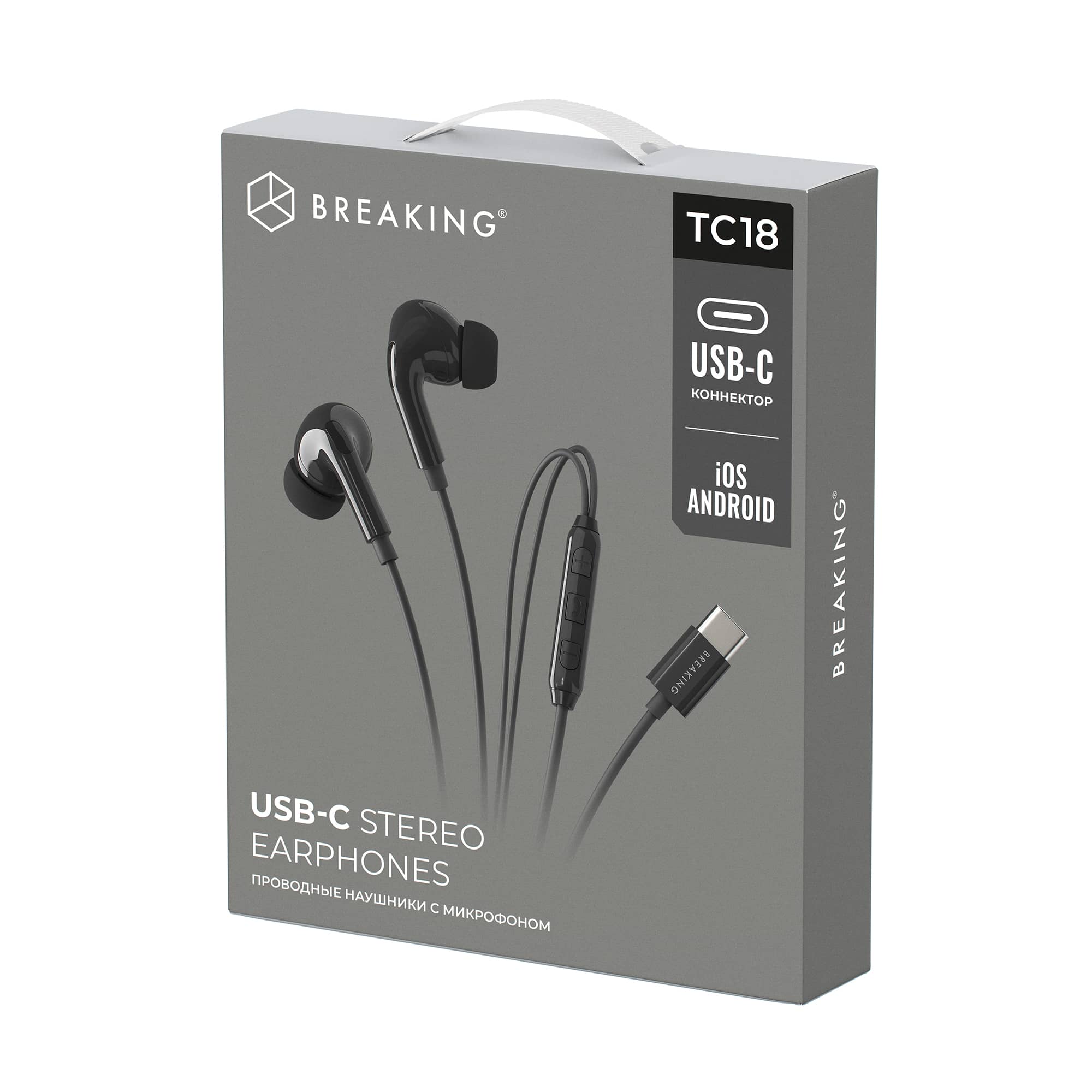 Проводная гарнитура BREAKING TC18 предназначена для прослушивания музыки. Подключается с помощью разъема USB-C. Наличие микрофона позволяет пользоваться наушниками как гарнитурой для разговоров по мобильному телефону. Легкие внутриканальные вкладыши имеют мягкую силиконовую конструкцию для комфортного использования, а также обладают широким частотным диапазоном, который обеспечивает четкий звук с хорошим качеством. Наушники изготовлены из экологического материала ABS пластика.