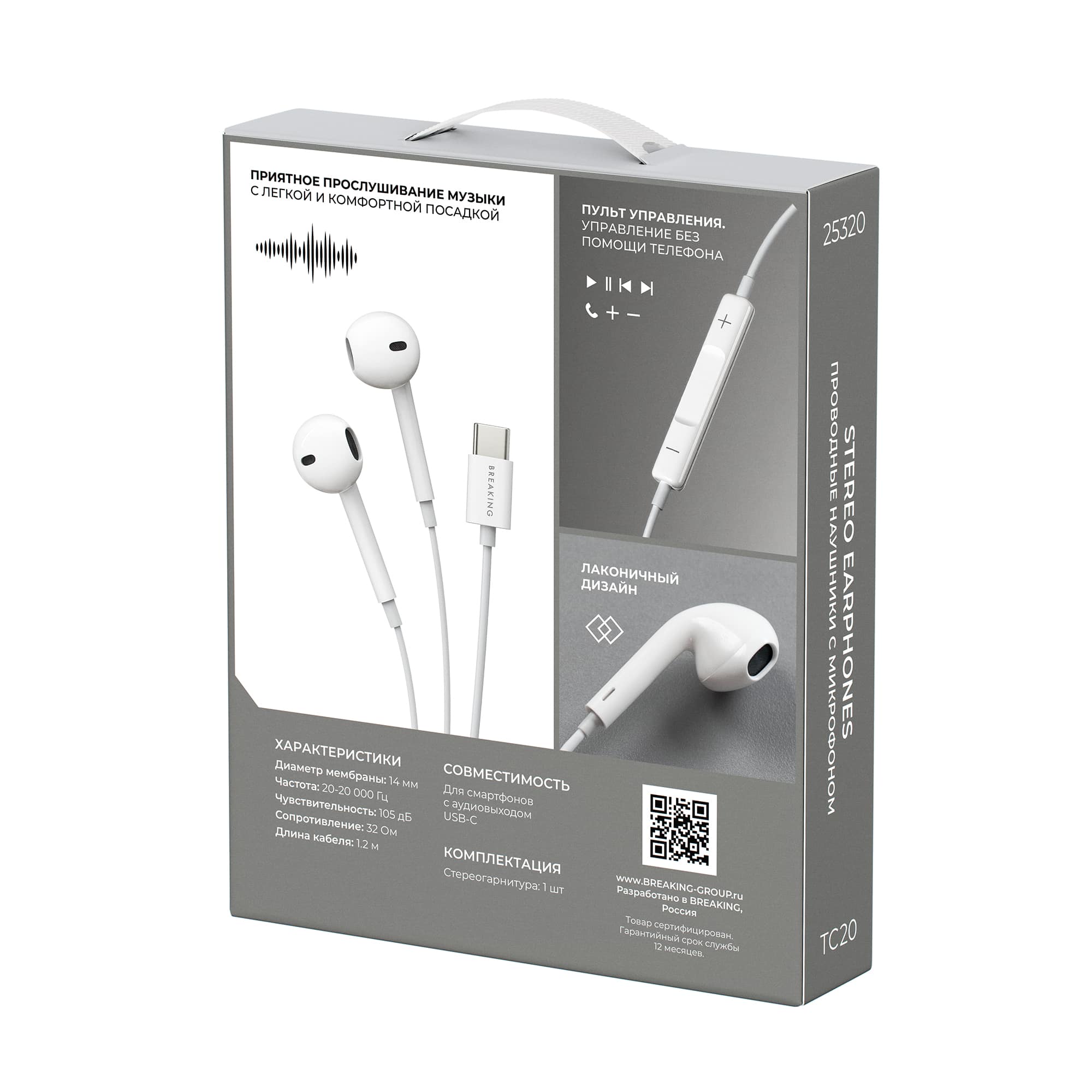 Проводная гарнитура BREAKING TC20 вставные с микрофоном. Это проводные наушники, которые обеспечивают отличное качество звучания и максимальную степень комфорта. Чувствительный микрофон и простое управление обеспечивают удобство при разговоре. Наушники проводные для телефона с разъёмом USB-C. Управление одной функциональной кнопкой. Дизайн стильный и минималистичный. На кабеле находится микрофон и кнопка для ответа на звонки, воспроизведения музыки.