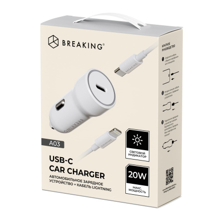 Автомобильное зарядное устройство BREAKING A03 выполнено из ABS-пластика. Модель рассчитана на входное напряжение 12-24V и обеспечивает выходную мощность до 20W и выходной ток до 3.0A. На устройстве имеется небольшой световой индикатор отображающий состояние заряда подключенной к нему техники.Модель поддерживает стандарт быстрой зарядки Power Delivery и Quick Charge 3.0,а так же функции защиты от перегрузок и короткого замыкания.