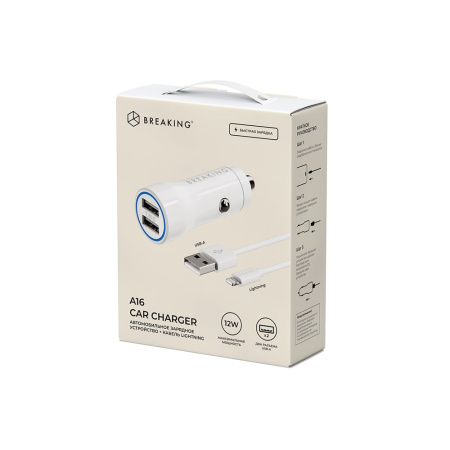 Автомобильное зарядное устройство BREAKING A16 выполнено из высокопрочного пластика. Модель рассчитана на входное напряжение 12-24V и обеспечивает выходную мощность до 12W и выходной ток до 2.4A. Два разъема USB-A позволяют заряжать одновременно два устройства. На блочке имеется небольшой индикатор, что обеспечивает дополнительное удобство. Модель поддерживает функцию защиты от перегрузок и короткого замыкания.