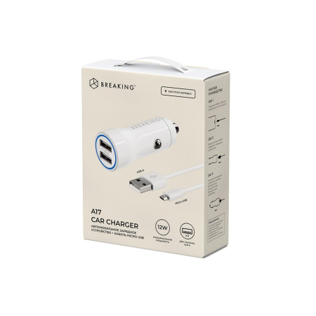 Автомобильное зарядное устройство BREAKING A17 выполнено из высокопрочного пластика. Модель рассчитана на входное напряжение 12-24V и обеспечивает выходную мощность до 12W и выходной ток до 2.4A. Два разъема USB-A позволяют заряжать одновременно два устройства. Достаточно подключить автомобильное зарядное устройство к бортовому прикуривателю вашей машины, чтобы оно начало пополнять емкость аккумулятора устройства или портативной техники. На блочке имеется небольшой индикатор, что обеспечивает дополнительное удобство. Модель поддерживает функцию защиты от перегрузок и короткого замыкания.