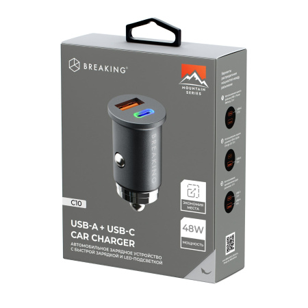 Автомобильное зарядное устройство Breaking C10 MOUNTAIN SERIES имеет быструю зарядку QC и PD. Выполнено из металла. Модель рассчитана на входное напряжение 12-24V и обеспечивает выходную мощность до 48W и выходной ток до 3A. Зарядка имеет функцию защиты от перегрузок и короткого замыкания. Достаточно подключить зарядное устройство к бортовому прикуривателю машины, чтобы оно начало пополнять емкость аккумулятора вашего устройства или портативной техники. Модель отличается компактными размерами. Кроме того, модель имеет световой индикатор заряда для удобства использования в темное время суток. Наличие 2 разъемов позволяет заряжать одновременно два гаджета. Автомобильное зарядное устройство оснащено функцией интеллектуального распределения мощности. К портам автомобильной зарядки можно присоединить любые устройства с кабелем USB-A и USB-C.