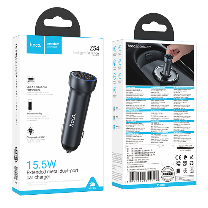 Hoco Z54 позволяет подзаряжать телефон в любое время в вашем авто. Данное зарядное устройство USB выполнено в стильном и надёжном алюминиевом корпусе, оснащено двумя USB разъемами, имеет выходной ток на каждый порт 2.4 А, его хватит для зарядки большинства устройств.
