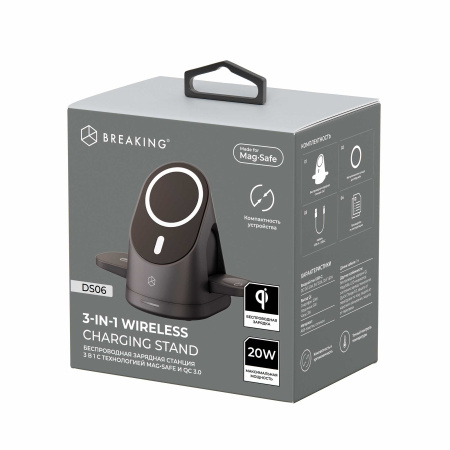 Беспроводная зарядная станция 3 в 1 BREAKING DS06, Qi 20W может одновременно заряжать смартфон, наушники и часы с поддержкой Qi. Смартфон присоединяется к станции при помощи кольца MagSafe. При подключении станции в сеть, на панели включается красная подсветка, что создает комфортные условия для эксплуатации в темное время суток. Световой индикатор меняет цвет в зависимости от того, какое устройство подключено. Благодаря качественному матовому ABS-пластику станция приятная на ощупь. Нижняя площадка корпуса выполнена из силикона, что не позволяет беспроводной зарядке скользить и царапаться. Мощность станции позволяет восполнить ресурс аккумулятора с высокой скоростью. Складные зарядные площадки и компактный размер модели создают комфортные условия для организации пространства. Комплектация включает кабель USB-A - USB-C, пластину-кольцо MagSafe и руководство по эксплуатации.