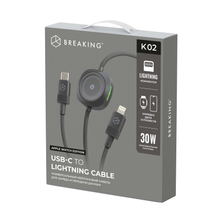 Кабель Breaking K02, USB-C - Lightning, Apple Watch Edition, 30W, 3А, 1м (Черный)