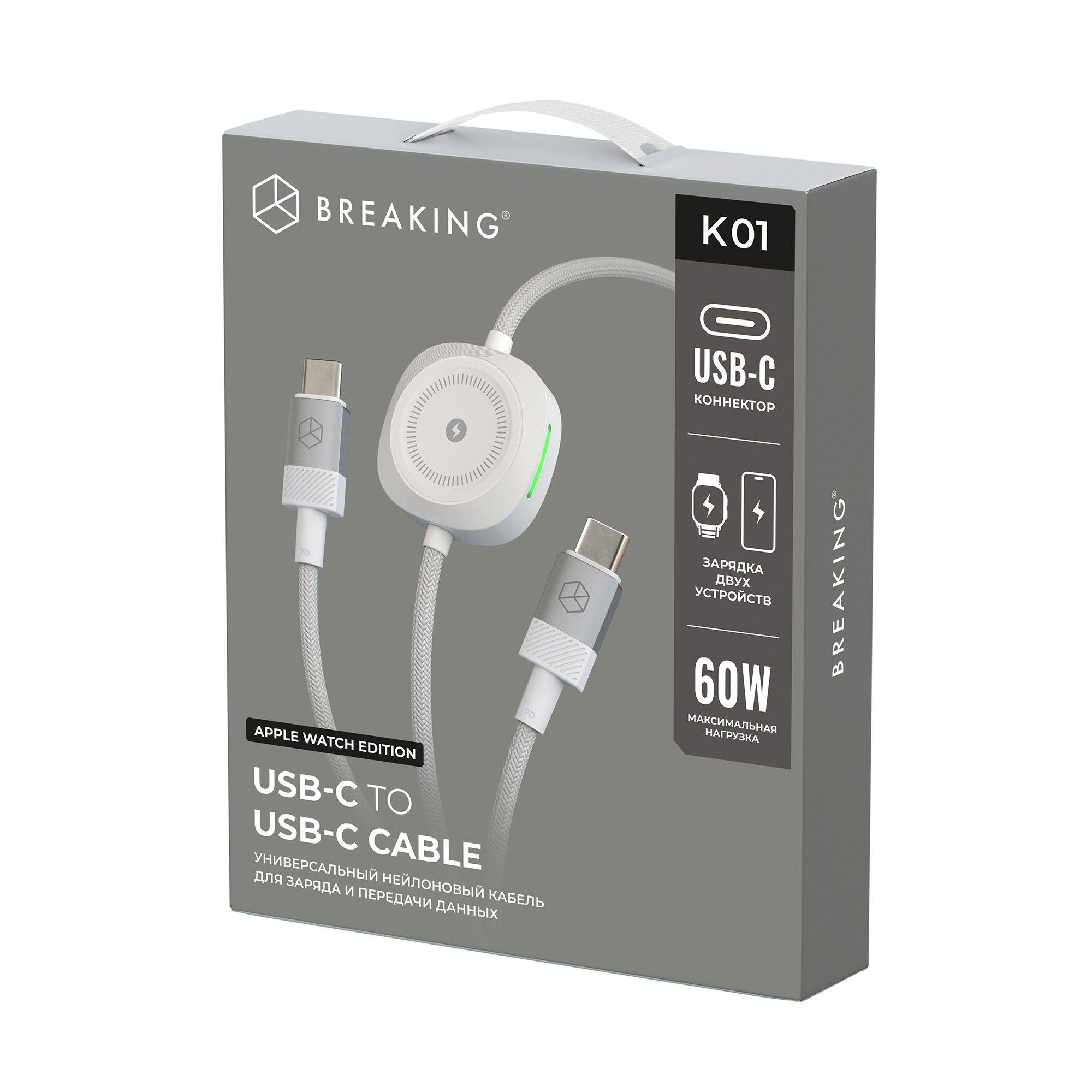 Кабель Breaking K01 Apple Watch Edition преназначен для одновременной зарядки устройств с разъемами Type - C и беспроводной зарядки Apple Watch. Обеспечит быструю зарядку подключается через разъем Type - C . Встроенный интеллектуальный чип обеспечивает быструю скорость зарядки для ваших часов. Тканевая оплетка и круглая форма кабеля делают его более прочным. Кабель легко переносит многочисленные сгибания.