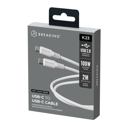 Кабель Breaking Soft Touch K23, USB-C - USB-C, 100W, 5.0А, 2м (Белый)