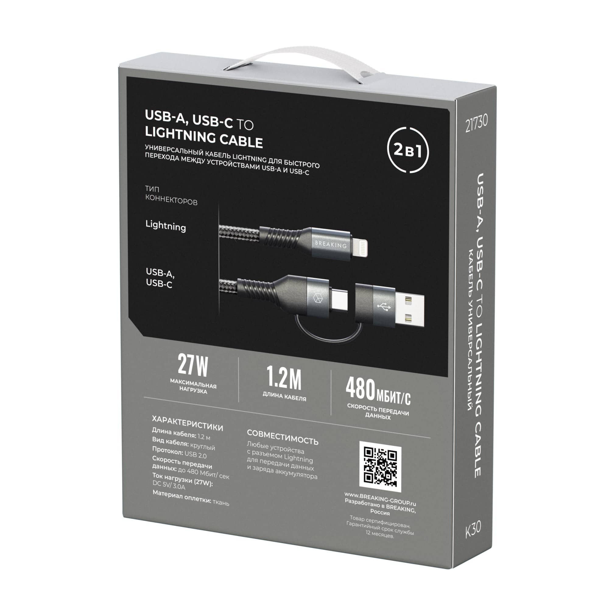 Кабель BREAKING K30 2 в 1, USB-A/USB-C – Lightning идеально подходит для зарядки и высокоскоростной передачи данных. Использовать его можно с устройствами с разъемом Lightning, скорость передачи данных до 480 Мбит/ сек. Кабель пропускает ток в 3.0 А., что предполагает возможность быстрой зарядки. За счет того, что провод облачен в тканевую оболочку, он отличается повышенной прочностью и стойкостью к механическим воздействиям. Особенность кабеля – это два варианта подключения.