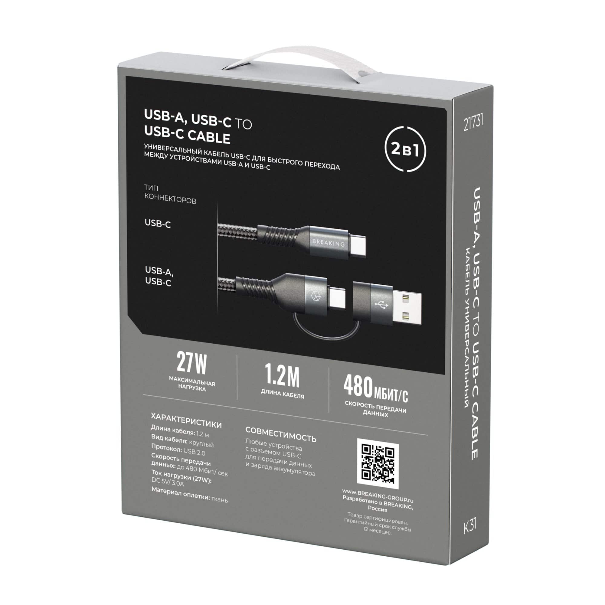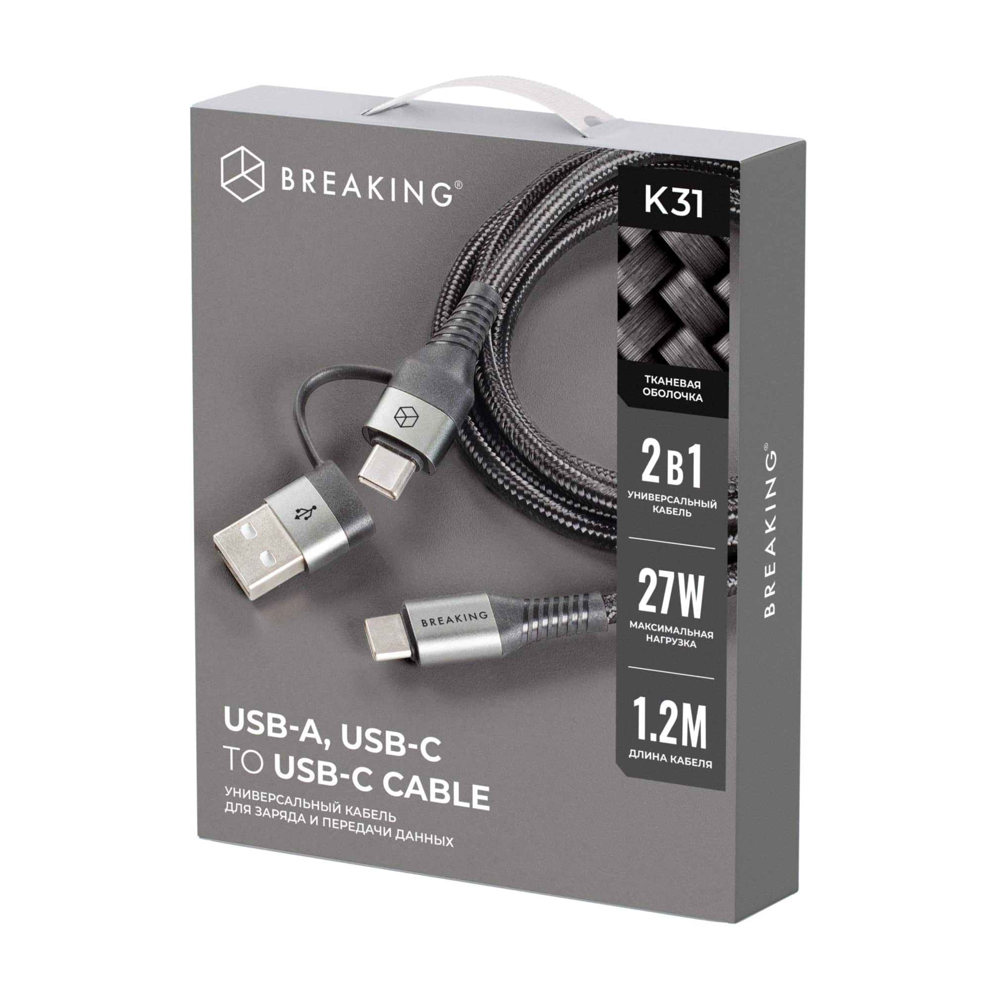 Кабель BREAKING K31 2 в 1, USB-A/USB-C – USB-C идеально подходит для зарядки и высокоскоростной передачи данных. Использовать его можно с устройствами с разъемом USB-C, скорость передачи данных до 480 Мбит/ сек. Кабель пропускает ток в 3.0 А., что предполагает возможность быстрой зарядки. За счет того, что провод облачен в тканевую оболочку, он отличается повышенной прочностью и стойкостью к механическим воздействиям. Особенность кабеля – это два варианта подключения.
