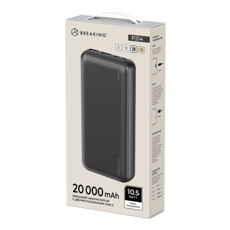 Внешний аккумулятор Breaking P214, 2USB-A, 20 000 mAh, 2.1A, 10.5W (Черный)