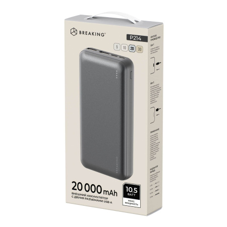 Внешний аккумулятор BREAKING P214 выполнен из прочного ABS-пластика с каучуковым покрытием. Емкость аккумулятора 20 000 mah. Модель рассчитана на входной ток Micro USB DC 5V/ 2.0A, USB-C DC 5V/ 2.0A и обеспечивает выходной ток USB-A DC 5V/ 2,1A до 10.5W. Наличие двух разъемов USB-A позволяет заряжать одновременно два устройства. Благодаря каучуковому покрытию павербанк устойчив к износу, царапинам и потертостям. Модель поддерживает технологию защиты от перегрузок и короткого замыкания. Светодиодный индикатор отображает уровень заряда и разряда внешнего аккумулятора.